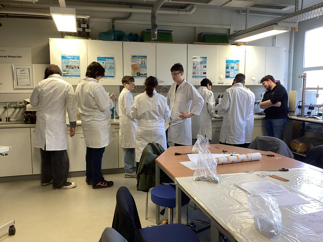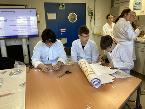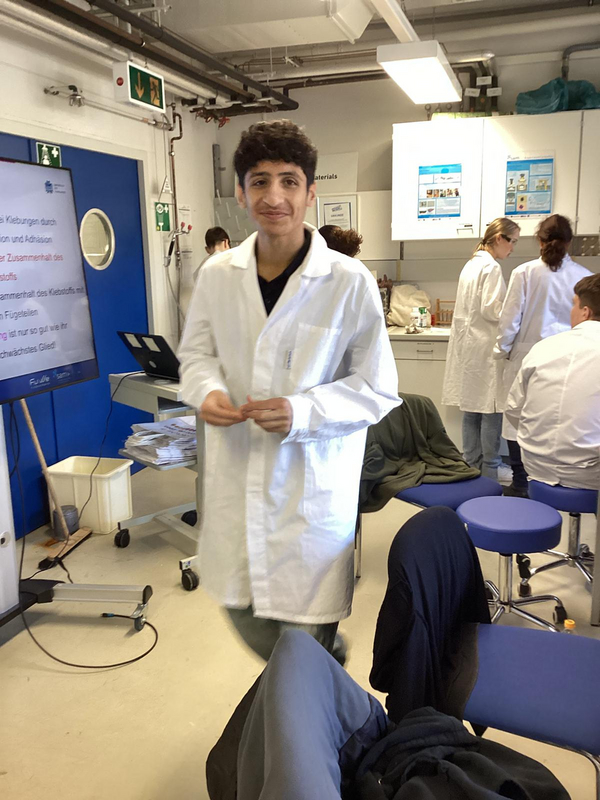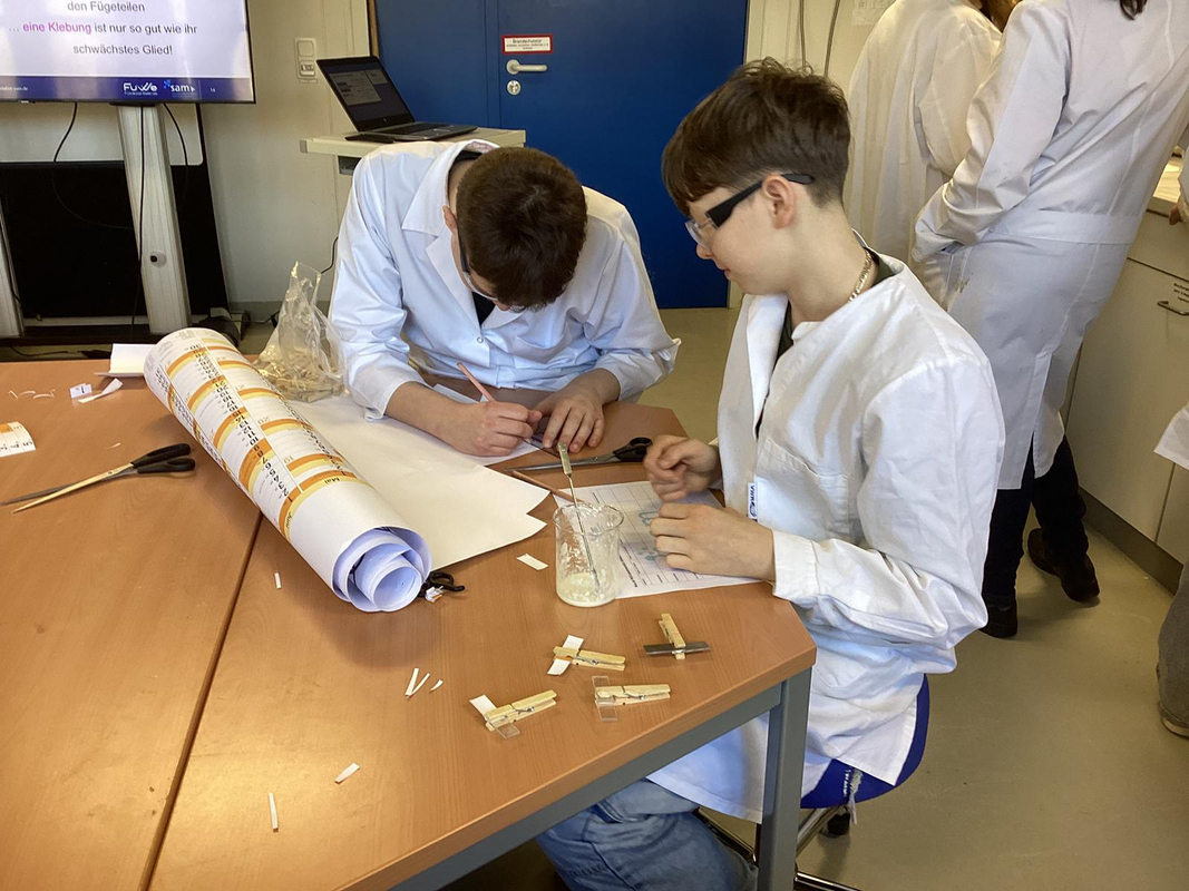 Im Labor wurde nicht nur zugeschaut, sondern kräftig experimentiert: Die Schülerinnen und Schüler stellten verschiedene Klebstoffe eigenständig her und gingen der Frage nach, was einen Kleber eigentlich stark macht. Anschließend wurde es spannend – denn die selbst entwickelten Mischungen mussten ihre Klebkraft auf unterschiedlichen Materialien wie Holz, Kunststoff oder Metall unter Beweis stellen.