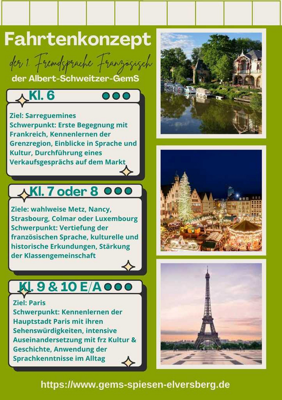 Um den Schülerinnen und Schülern unserer Schule einen lebendigen Zugang zur französischen Sprache und Kultur zu ermöglichen, haben wir ein Fahrtenkonzept entwickelt, das die Sprachpraxis mit authentischen Erlebnissen vor Ort verbindet.